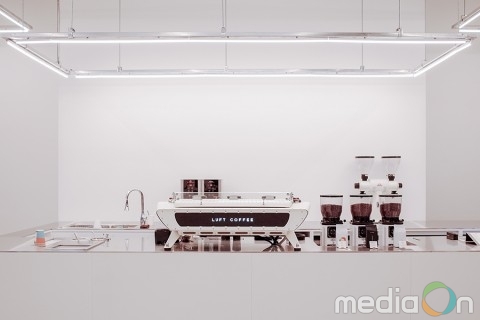 전체적으로 깔끔한 화이트톤과 노출 콘크리트 느낌의 벽면으로 연출된 루프트 커피 광화문점은 통유리를 통해 들어오는 햇살마저 공간 연출의 요소가 돼 단순하면서도 자연스러운 멋을 느낄 수 있다. 그뿐만 아니라 매장 기둥에 설치된 스피커가 공간을 채우는 사운드를 책임지는 동시에 아름다운 오브제 역할까지 하며 공간을 완성시킨다.